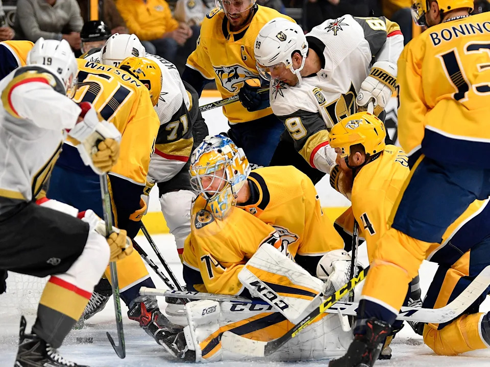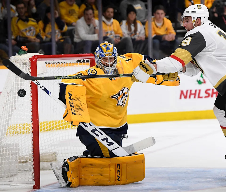 Predators goaltender Juuse Saros (74) blocks a shot on goal by Golden Knights right wing Reilly Smith (19) during the second period at Bridgestone Arena Wednesday, Nov. 27, 2019 in Nashville, Tenn.