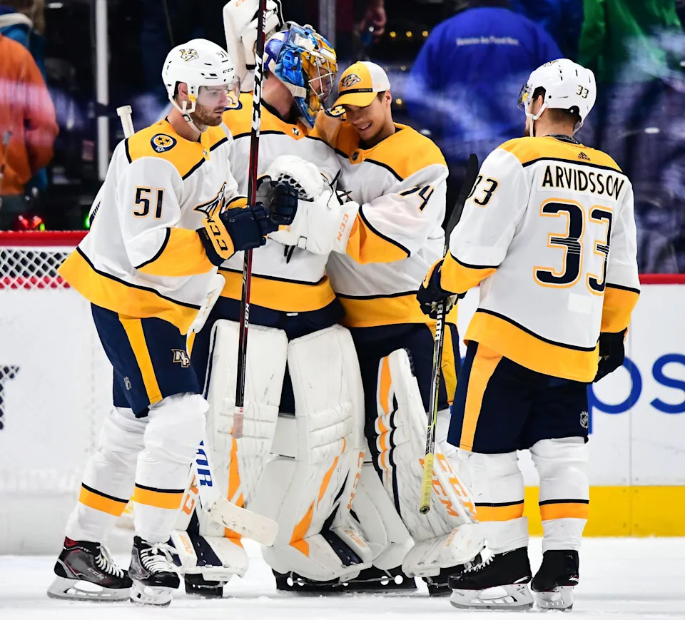 Nashville Predators left wing Austin Watson (51) goaltender Pekka Rinne (35) goaltender Juuse Saros (74) and right wing Viktor Arvidsson (33) celebrate the win over the Colorado Avalanche at the Pepsi Center.