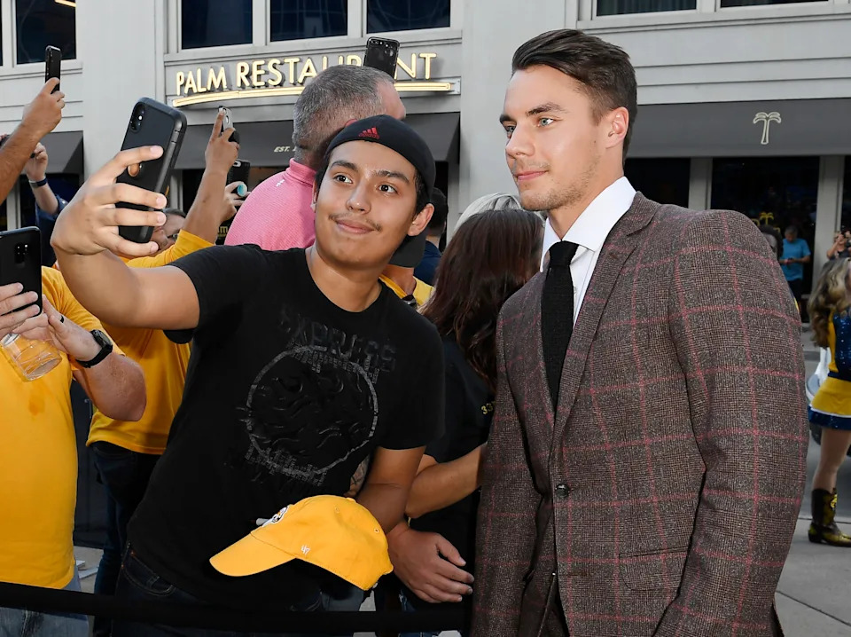 Nashville Predators goaltender Juuse Saros (74) poses with a fan during the 2019 Gold Walk before the home opener at Bridgestone Arena in Nashville, Tenn., Thursday, Oct. 3, 2019.
