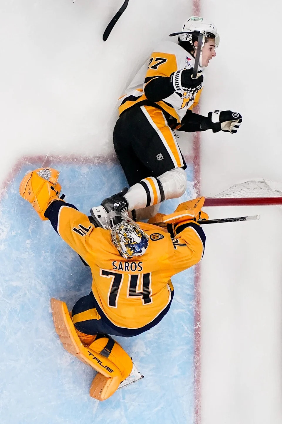 Pittsburgh Penguins defenseman Ryan Graves (27) collides with Nashville Predators goaltender Juuse Saros (74) during the third period at Bridgestone Arena in Nashville, Tenn., Thursday, Dec. 19, 2024.