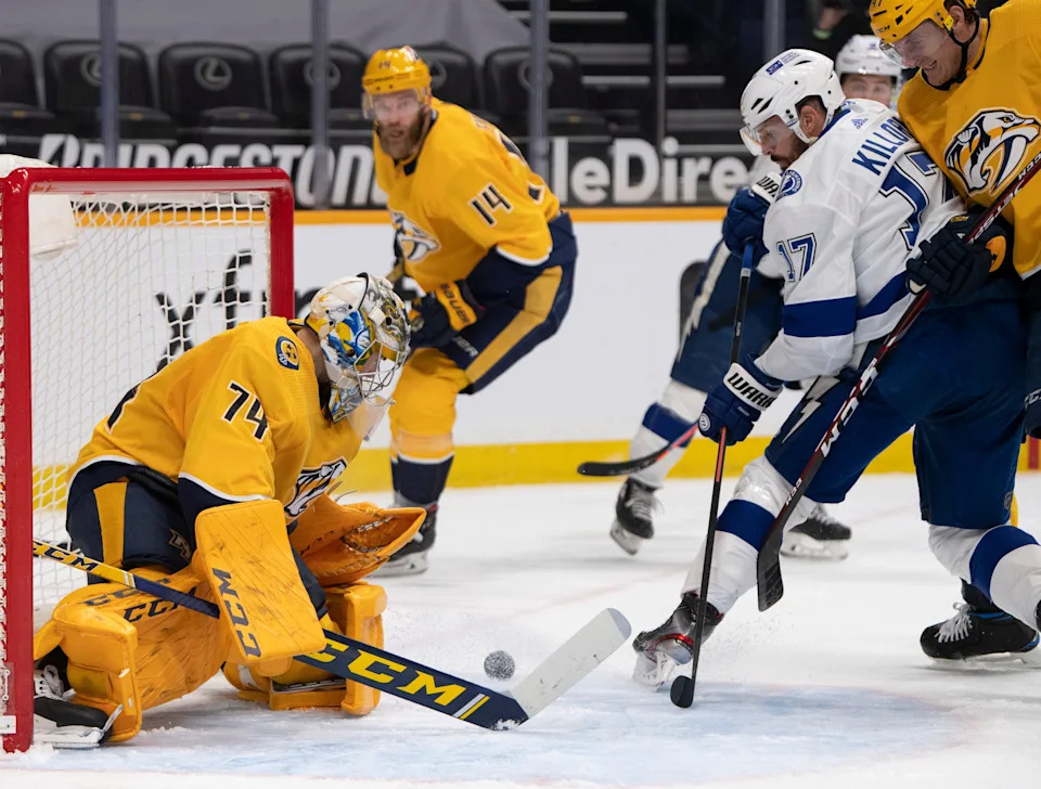 Nashville Predators goaltender Juuse Saros (74) defends the goal as Tampa Bay Lightning left wing Alex Killorn (17) tries to shoot the puck into the net during the second period at Bridgestone Arena Tuesday, Feb. 9, 2021 in Nashville, Tenn.