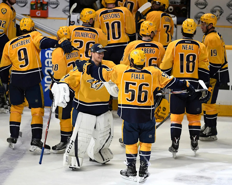 Nashville Predators left wing Kevin Fiala (56) celebrates with goalie Juuse Saros (74) and his teammates after his goal won game three in the first-round NHL playoff series at the Bridgestone Arena, Tuesday, April 18, 2017, in Nashville, Tenn.