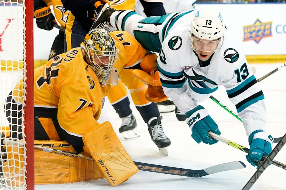 San Jose Sharks center Nick Bonino (13) collides with Nashville Predators goaltender Juuse Saros (74) during the second period of an NHL Global Series game at the O2 Arena in Prague, Czech Republic, Friday, Oct. 7, 2022.