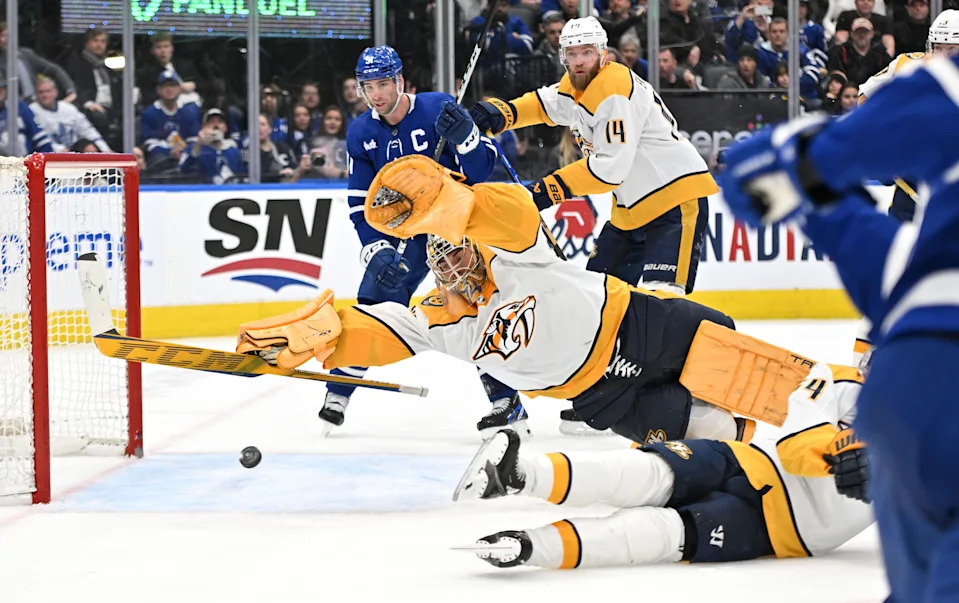 Jan. 11: Nashville Predators goaltender Juuse Saros dives but cannot stop the shot from Toronto Maple Leafs forward Mitchell Marner.