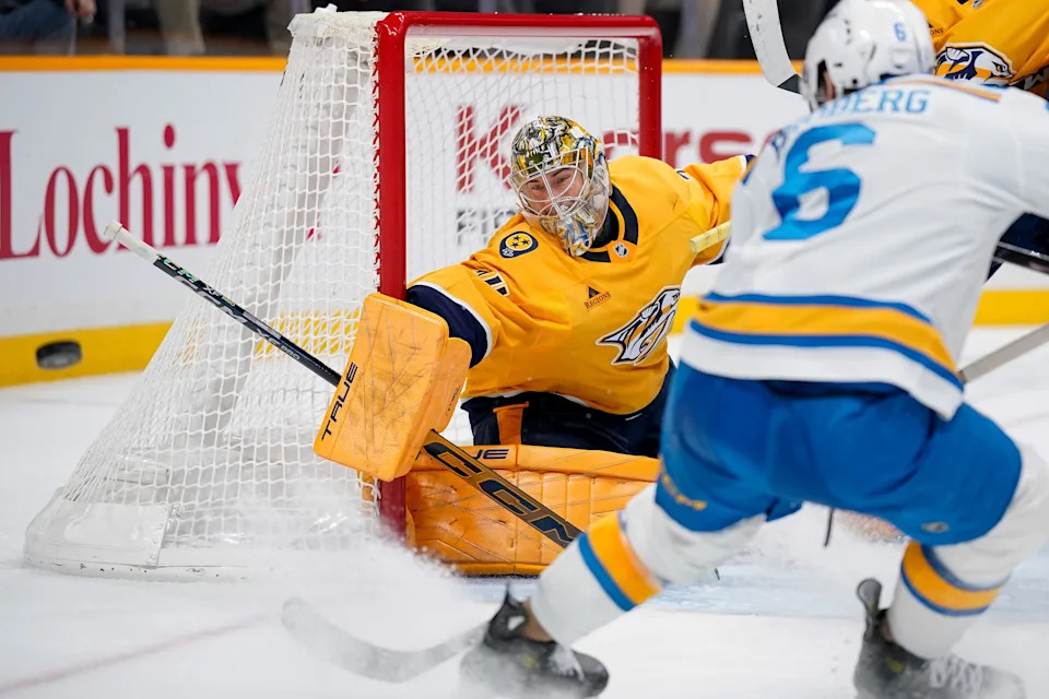 Nashville Predators goaltender Juuse Saros (74) defends against the Buffalo Sabres during the second period at Bridgestone Arena in Nashville, Tenn., Tuesday, Jan. 20, 2026.