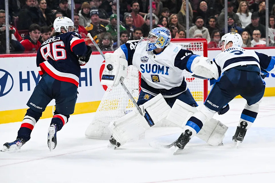Feb 13, 2025; Montreal, Quebec, CAN; [Imagn Images direct customers only] Team Finland goalie Juuse Saros (74) makes a save against Team USA forward Jack Hughes (86) in the first period during a 4 Nations Face-Off ice hockey game at Bell Centre. Mandatory Credit: David Kirouac-Imagn Images