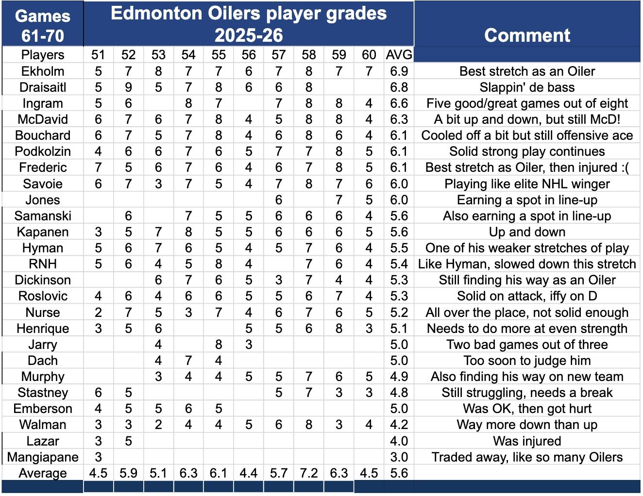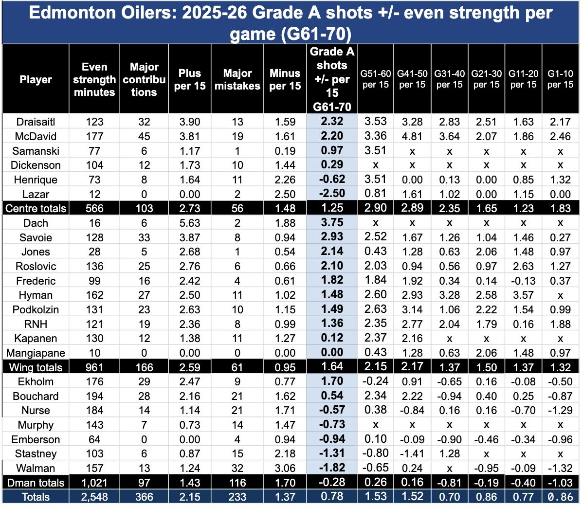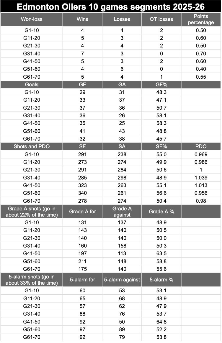 Overall in this past segment, Games 61 to 70, Edmonton had five wins and five losses, with one loser point. They were out-scored as a team by six goals, 32 for, 38 against. But they had decent Grade A shot metrics, 17.5 for per game compared to 14 against per game. With better goaltending they would have had one more win, but not to be.