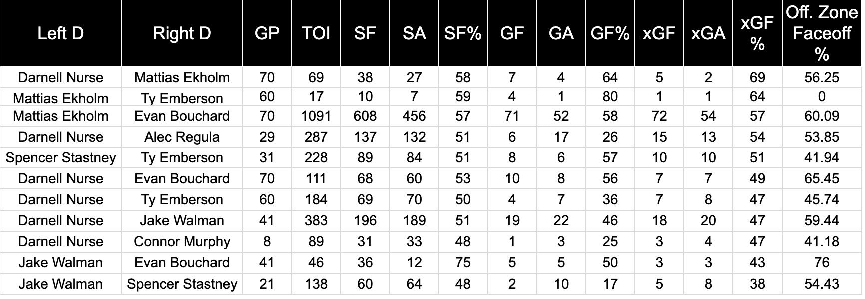 Here is a list of the main Oil pairings of existing d-men on the team, ranked on their expected goals for percentage (a shot quality plus-minus metric).