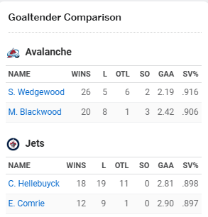 The stats for the Jets & Avs are pretty lopsided….but Winnipeg does have the better powerplay somehow. Colorado have scored 6 more goals than the nearest NHL franchise and an impressive 18 less goals against than the 2nd place Tampa Bay Lightning. The team is having a dominant season and will have every player in their line up except Nicholas Roy, so they should represent a real test for the True Northers tonight.