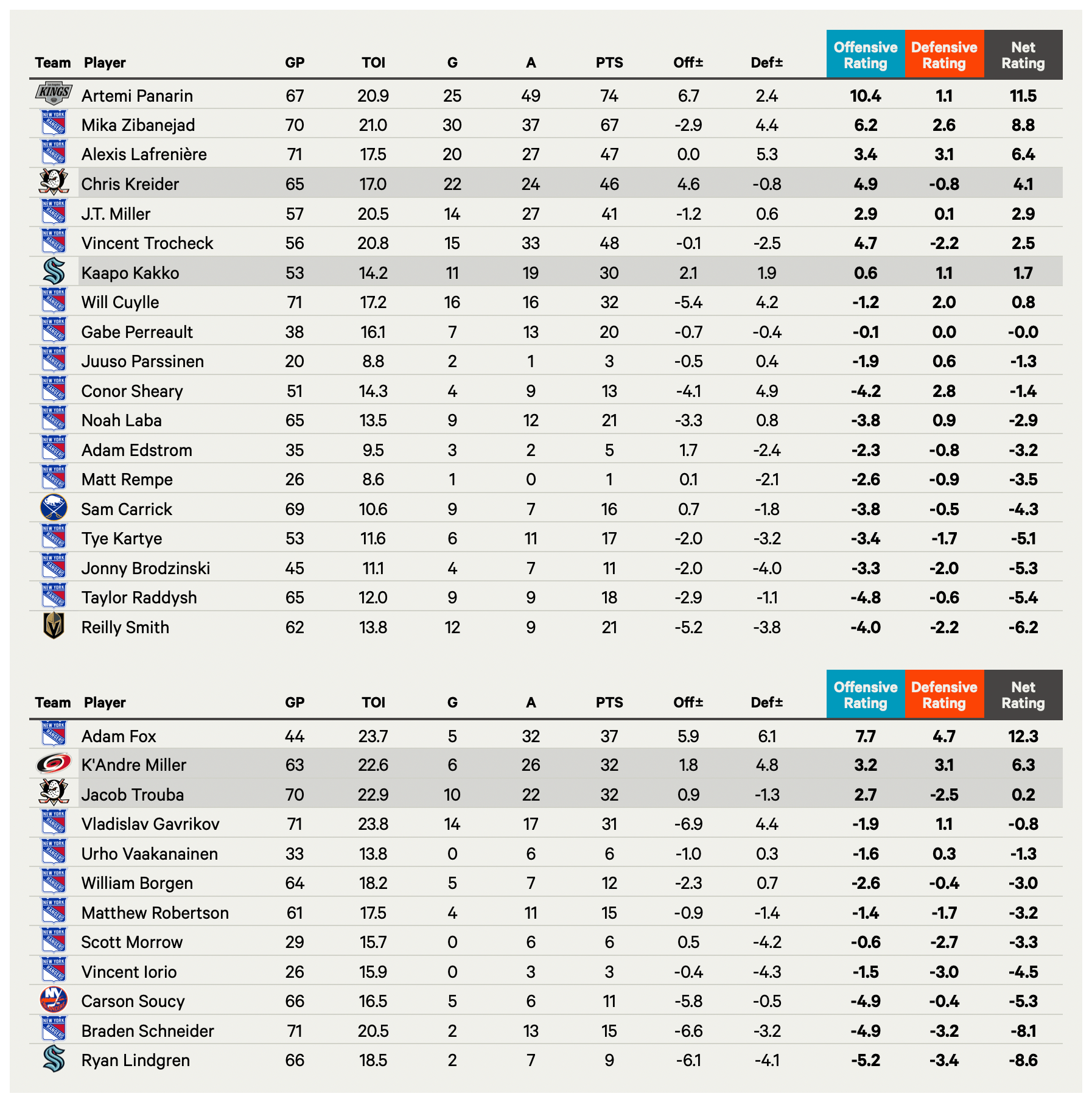 The Offensive, Defensive and Net Ratings of the Rangers’ NHL players, as well as players they traded away on new teams. (Courtesy of Dom Luszczyszyn)
