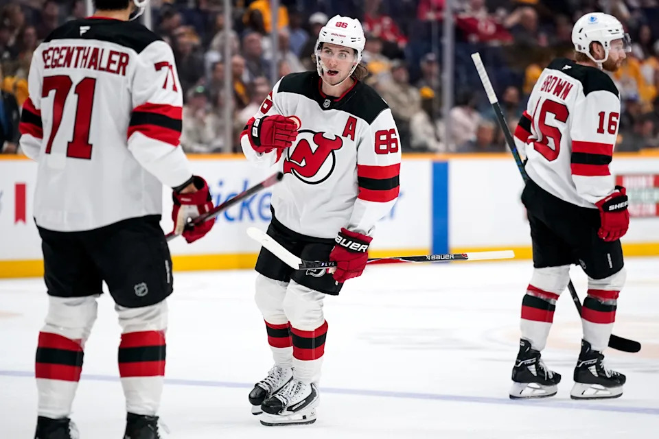 New Jersey Devils center Jack Hughes (86) celebrates his goal against the Nashville Predators during the first period at Bridgestone Arena in Nashville, Tenn., Thursday, March 26, 2026.