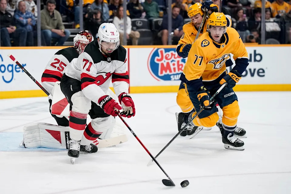 New Jersey Devils defenseman Jonas Siegenthaler (71) fights for control of the puck with Nashville Predators right wing Luke Evangelista (77) during the first period at Bridgestone Arena in Nashville, Tenn., Thursday, March 26, 2026.