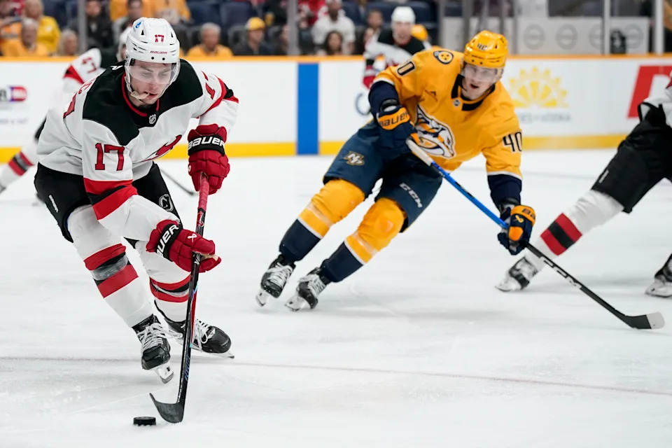 New Jersey Devils defenseman Simon Nemec (17) moves the puck away from Nashville Predators center Fedor Svechkov (40) during the first period at Bridgestone Arena in Nashville, Tenn., Thursday, March 26, 2026.