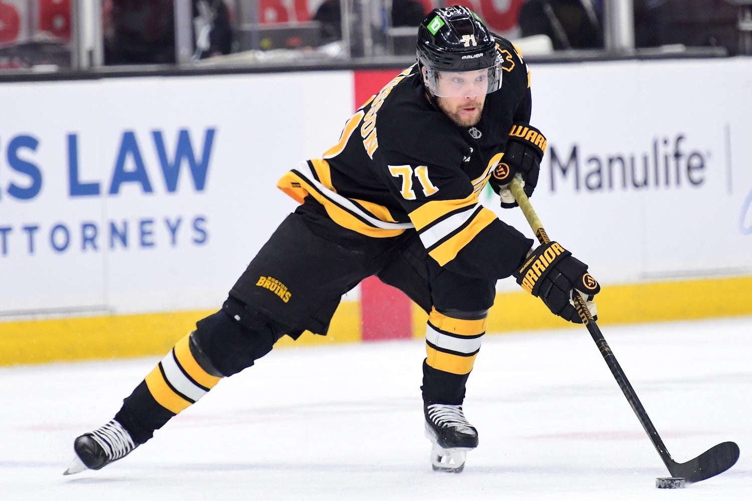 Mar 28, 2026; Boston, Massachusetts, USA; Boston Bruins left wing Viktor Arvidsson (71) skates with the puck during the third period against the Minnesota Wild at TD Garden. (Bob DeChiara-Imagn Images)