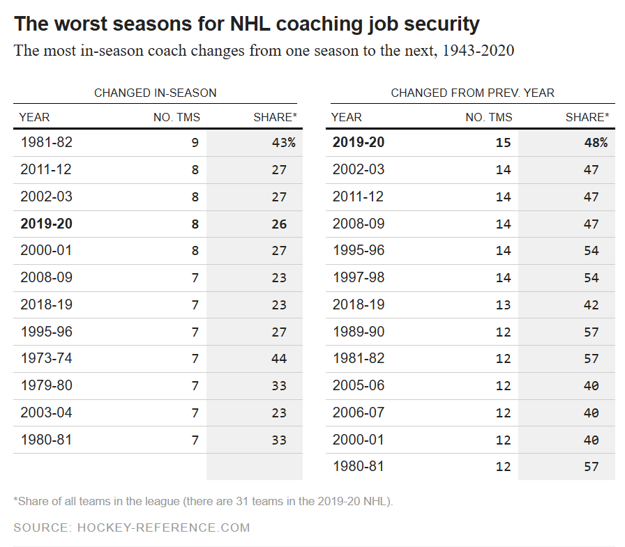 The reasons for this season’s bloodbath have been unusually varied, too. Most of the time, a coach is fired either for a poor record relative to expectations, for a lack of recent playoff appearances or because of a sudden shift in front-office politics. And that certainly applies to some of this year’s shakeups: Boudreau, Mike Babcock (Toronto), John Hynes (New Jersey), Peter DeBoer (San Jose), Peter Laviolette (Nashville) and Gerard Gallant (Vegas) were all fired after underwhelming starts to the 2019-20 season, with Boudreau, Babcock and Gallant each being fired by a general manager who hadn’t originally hired them (and Hynes being fired by a GM who himself was let go about a month later).