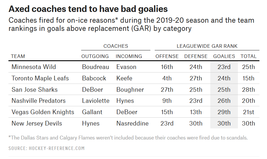 Sure enough, if we measure goaltending by goals above replacement (GAR), which adds up the total net goals added or saved by each skater and goalie based on his box score stats, none of the six teams that fired their coaches for poor performance this season ranks any higher than 23rd in GAR between the pipes: