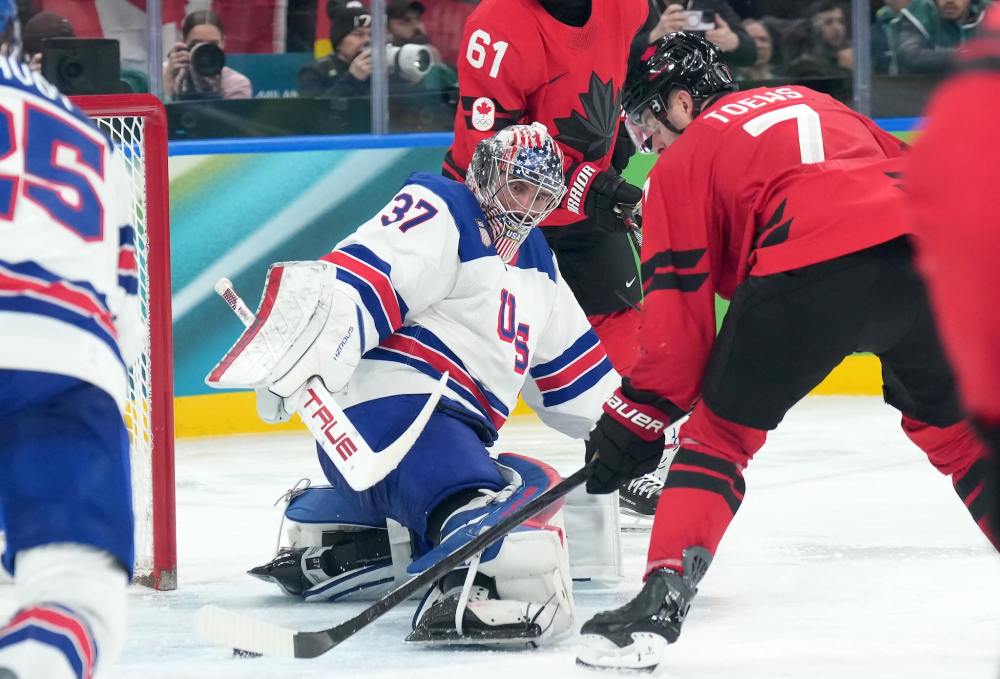 Goalie Connor Hellebuyck makes a stick save for the United States against Canada’s Devon Toews in the men’s gold medal hockey game at the 2026 Winter Olympics in February.