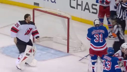 Fast forward 10 seconds and Jacob Markstrom is standing at the top of New York’s crease with his mask off and ready to throw.