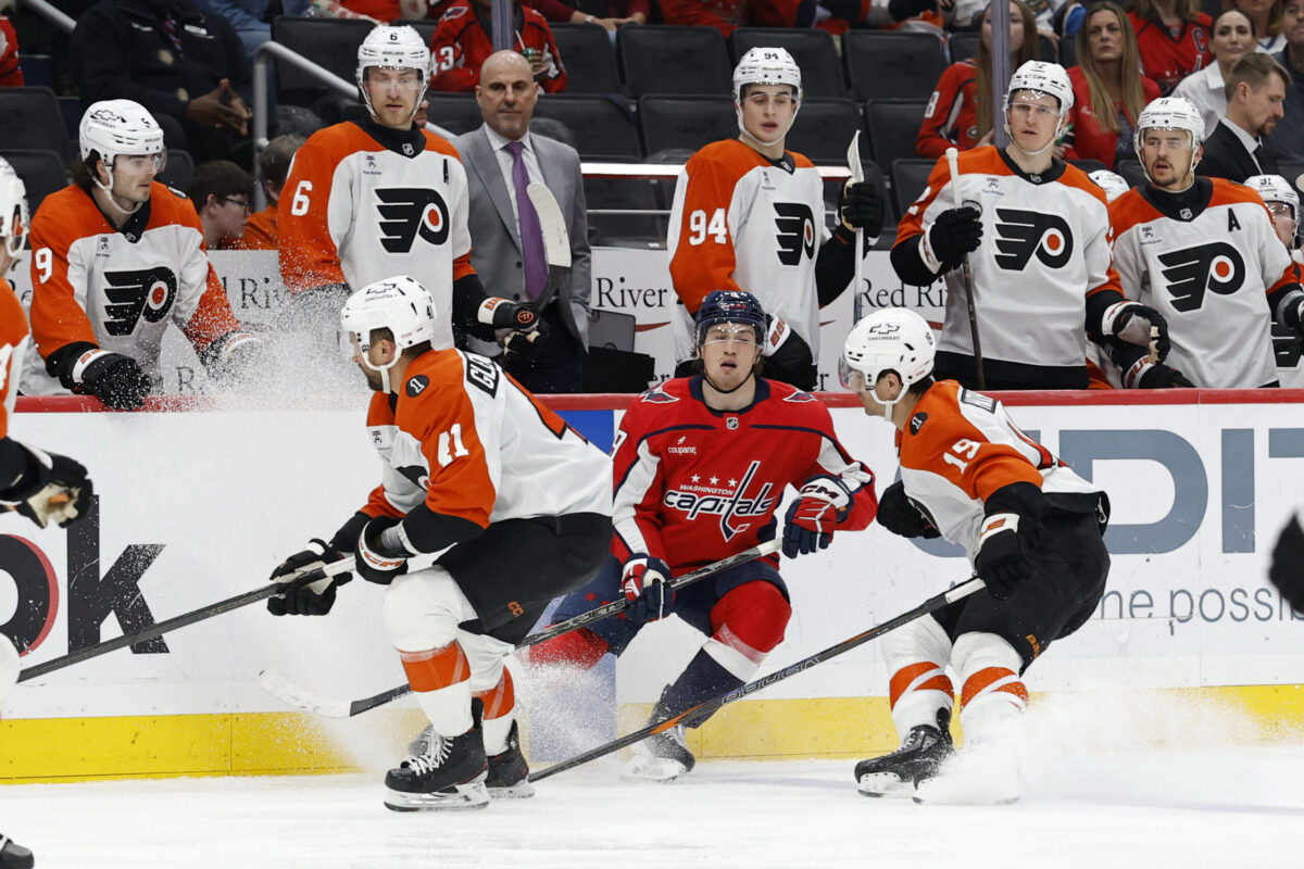 Mar 31, 2026; Washington, District of Columbia, USA; Philadelphia Flyers center Luke Glendening (41) and Flyers right wing Garnet Hathaway (19) battle for the puck with Washington Capitals right wing Ryan Leonard (9) during the second period at Capital One Arena. Mandatory Credit: Geoff Burke-Imagn Images