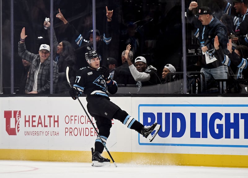 Utah Mammoth right wing JJ Peterka (77) celebrates scoring a goal in the second period as the Utah Mammoth and Calgary Flames play at the Delta Center in Salt Lake City on Wednesday, Oct. 15, 2025. | Scott G Winterton, Deseret News