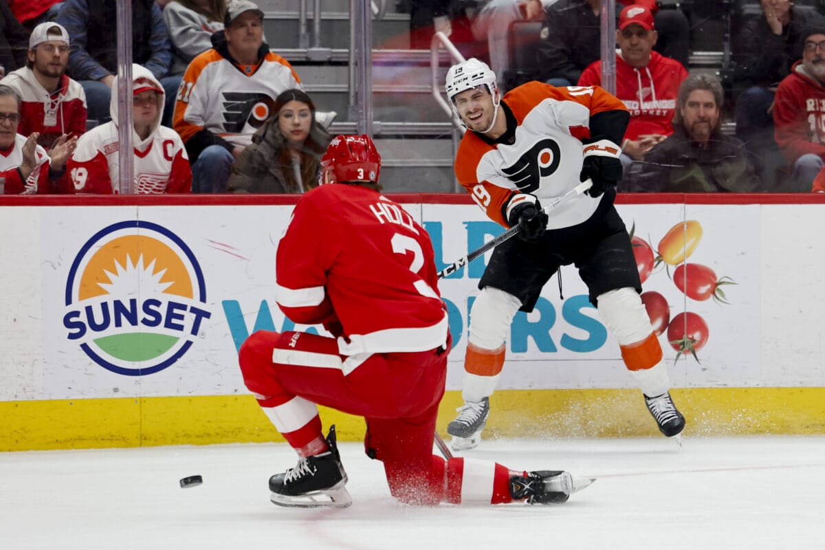 Jan 25, 2024; Detroit, Michigan, USA; Philadelphia Flyers right wing Garnet Hathaway (19) takes a shot defended by Detroit Red Wings defenseman Justin Holl (3) in the first period at Little Caesars Arena. Mandatory Credit: Rick Osentoski-USA TODAY Sports