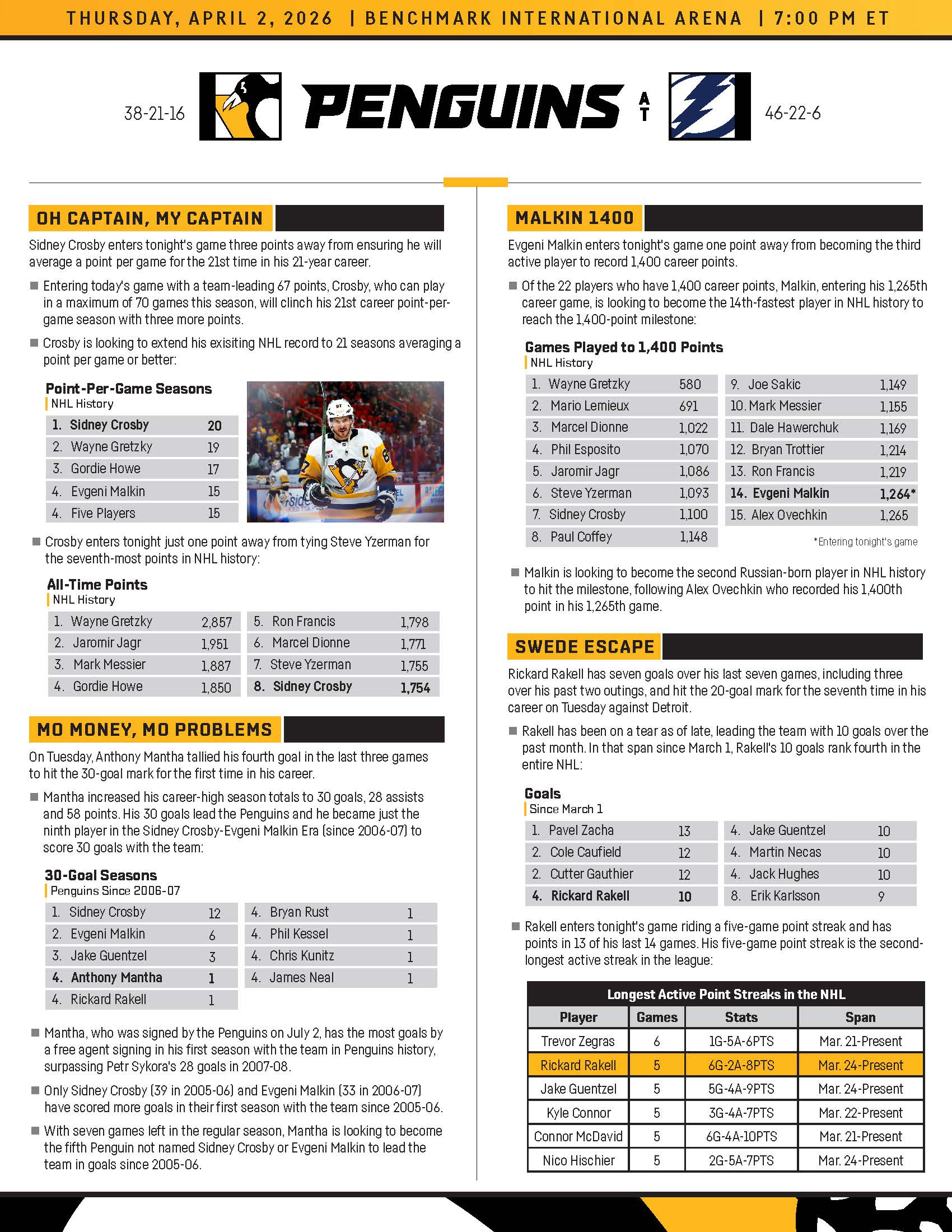 Soderblom set to appear in 100th career NHL gamesBryan Rust (498) looking to become 11th player to score 500 points as a PenguinEvgeni Malkin (1,399) looking to become 23rd player in NHL history with 1,400 pointsEgor Chinakhov (18) looking for first career 20-goal seasonAnthony Mantha (58) is approaching the 60-point plateau for the first time