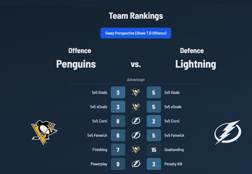 Tampa is stacked all over the board, they’re second in 5v5 goals, top-10 in Corsi, Fenwick and finishing metrics offensively. That and the star power is what they’re known for, but they’ve really buckled down defensively this season as well. Their PK is good, their goaltending is a lot better with Vasilievskiy than backup Johansson and they find ways to limit the amount of shots opponents take. Despite an anonymous defense that’s missed a bunch of their top blueliners at the same time, they’ve found ways to play keep-away with the puck and limit opportunities against.