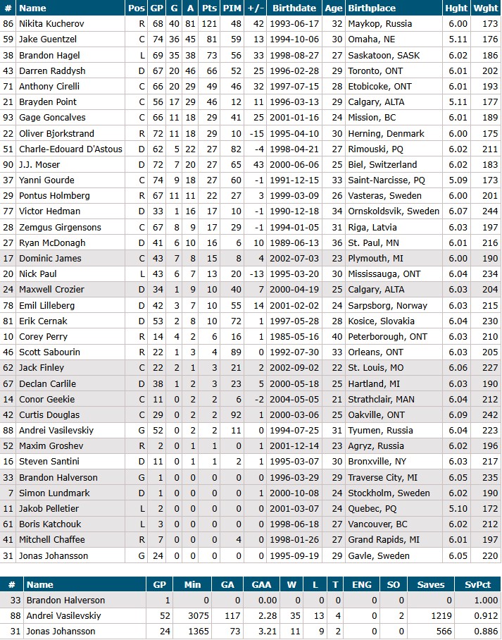 Goalies: Andrei Vasilevskiy, Jonas Johansson