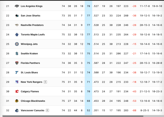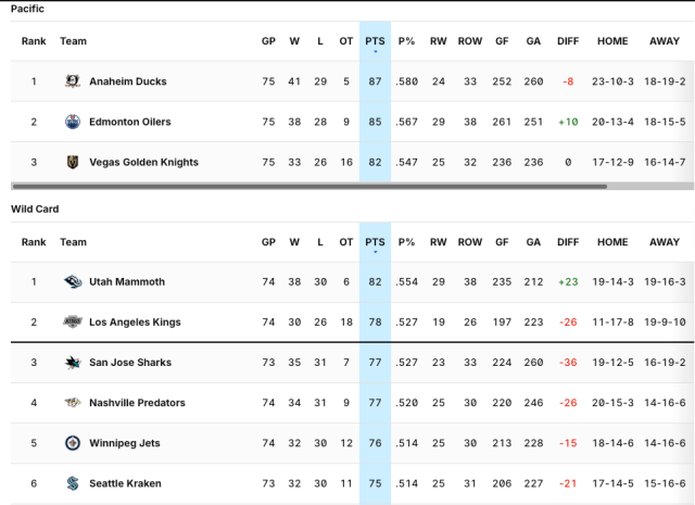 Keep an eye on the RW column, also known as regulation wins. The Kings and Sharks have the best points percentage of teams not named the Utah Mammoth. The Sharks are well ahead of the Kings in regulation wins, so if it comes down to the tiebreaker, the Sharks have the advantage at this point.