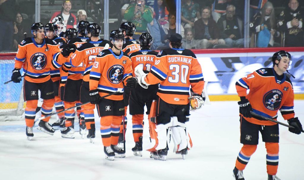 San Diego moved five points behind Henderson in the division standings, six points behind Bakersfield, seven points behind Coachella Valley and eight points behind San Jose.  The Gulls are 17 points behind first place Ontario and 16 points behind second place Colorado.