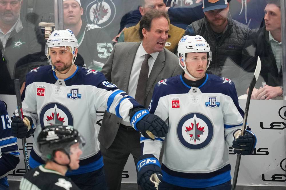 Winnipeg Jets head coach Scott Arniel, center, reacts during the third period of an NHL hockey game against the Dallas Stars Monday, Feb. 2, 2026, in Dallas.