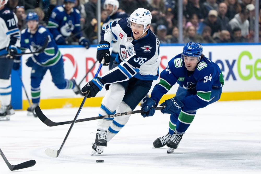 Winnipeg Jets Morgan Barron (36) and Vancouver Canucks Linus Karlsson (94) vie for the puck during the second period of an NHL hockey game in Vancouver, B.C., on Wednesday, Feb. 25, 2026.