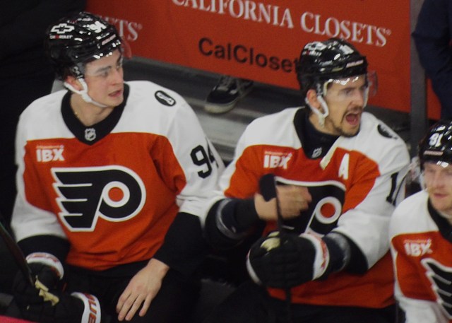 It was humorous that during the entire discussion of when the puck entered the net as opposed to when contact was made with the goaltender it never seemed to factor in that Konecny’s involvement with all of it appeared to be totally involuntary. He was totally thrown into the situation. When the secondary announcement was made team mates skated to the bench to congratulate TK on his 27th goal of the season and Martone on his 1st NHL point.