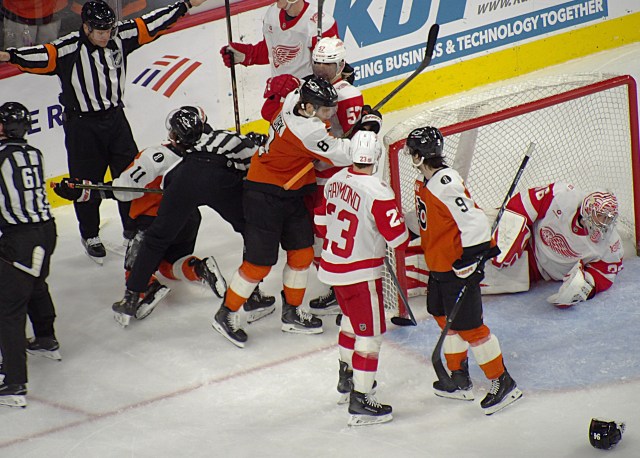 Midway through the 3rd period Porter Martone fired a shot from the point that hit Travis Konecny in the chest while he was being mugged and thrown into Detroit’s goaltender John Gibson. The puck ended up in the net.