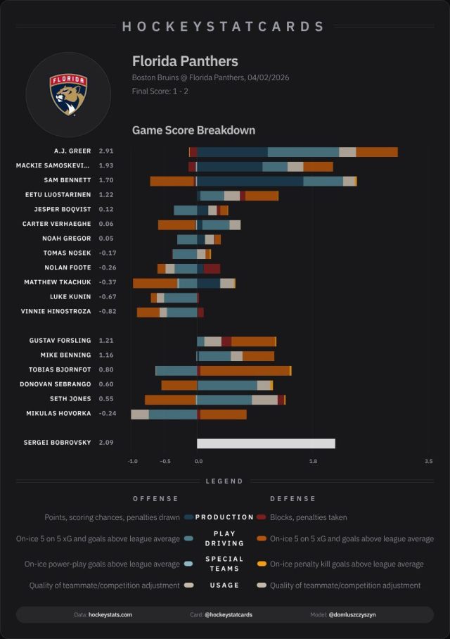 Another fast start and a high-level performance from Sergei Bobrovksy propelled the Florida Panthers to a 2-1 victory over the Boston Bruins at Amerant Bank Arena.