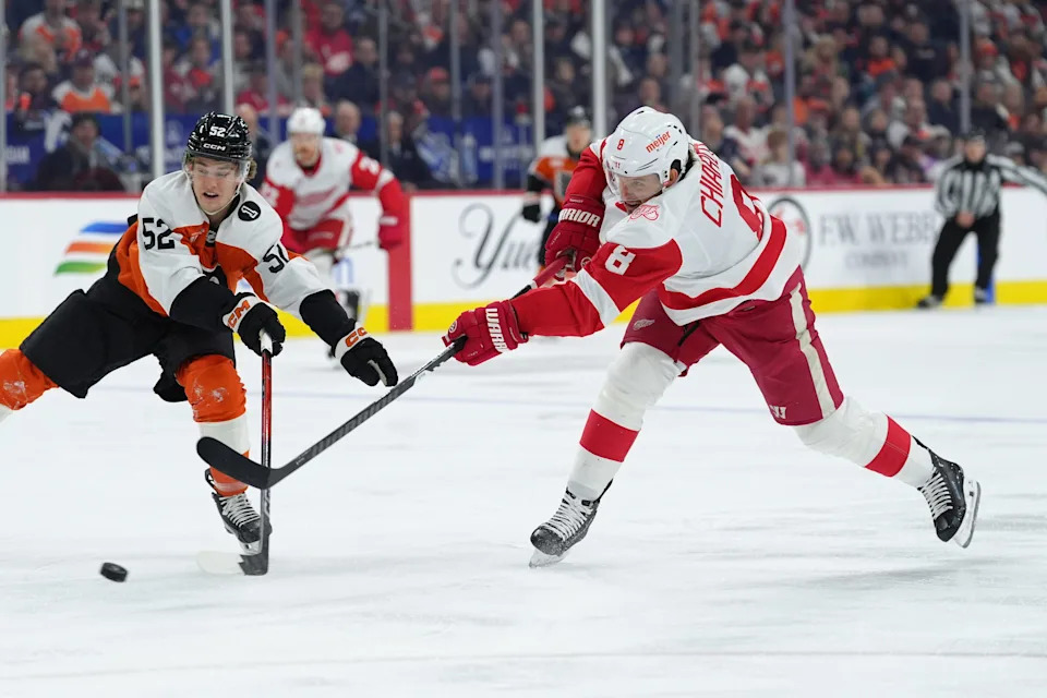 Detroit Red Wings defenseman Ben Chiarot (8) shoots the puck against Philadelphia Flyers center Denver Barkey (52) in the first period at Xfinity Mobile Arena in Philadelphia on Thursday, April 2, 2026.