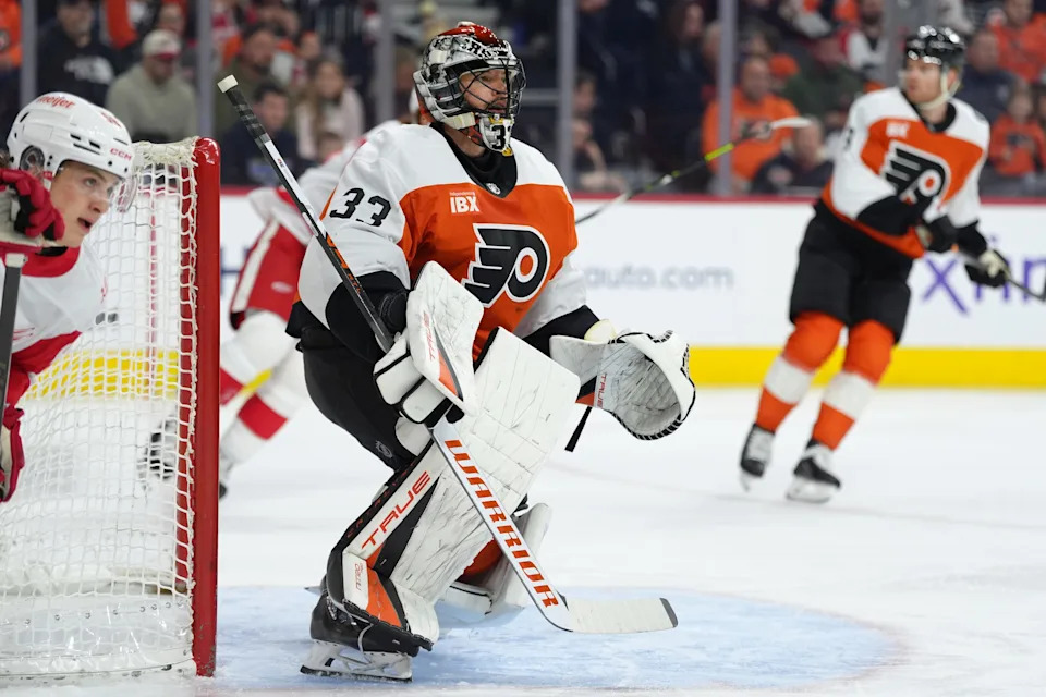 Philadelphia Flyers goalie Samuel Ersson (33) in action against the Detroit Red Wings in the first period at Xfinity Mobile Arena in Philadelphia on Thursday, April 2, 2026.