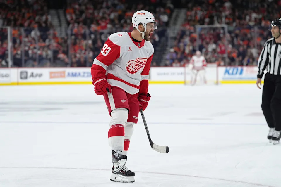 Detroit Red Wings right wing Alex Debrincat (93) reacts after scoring a goal against the Philadelphia Flyers in the first period at Xfinity Mobile Arena in Philadelphia on Thursday, April 2, 2026.