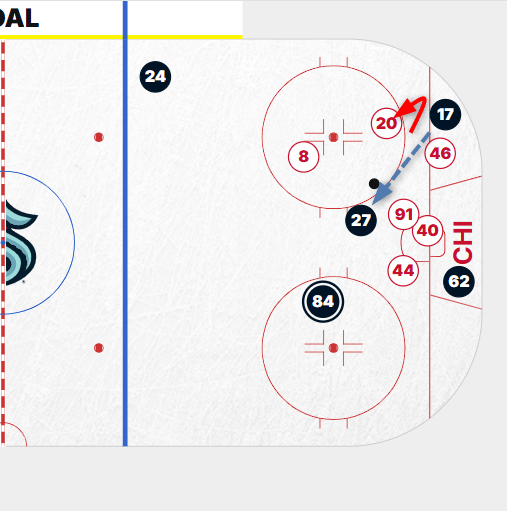 The third period started off with a solid penalty kill from Chicago, but Seattle applied the pressure at 5-on-5. The Kraken had a 69.13 percent expected goal share at 5-on-5 and led in high danger chances 6-1. I wouldn’t blame this on the Hawks totally turtling it in, Wyatt Kaiser did make a nice play at his blue line to steal the puck from Seattle and drive through the neutral zone. But the Hawks did suffer from defensive zone breakdowns: that second goal was due to exposed coverage and possible miscommunication between Louis Crevier and Ryan Greene. Below is a screenshot of the passing lane created from that lapse in coverage.