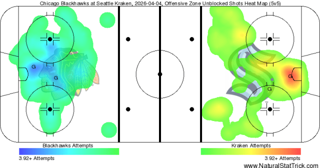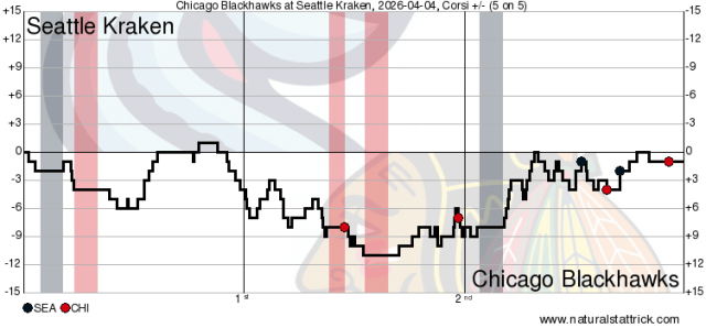 This was a mostly complete effort from the Blackhawks and certainly their best out of their recent games. The Hawks finished with a 50.51 percent shot attempt share and a 50.63 percent expected goals share (both at 5-on-5), and their strongest efforts were in the first two periods. Chicago had the advantage in 5-on-5 scoring chances through the first two at 19-16. Both teams had moments of sloppy mistakes, which led to turnovers. Seattle just ended up being more sloppy, and Chicago being a lot faster. In fact, I think this game speaks more about the Kraken.