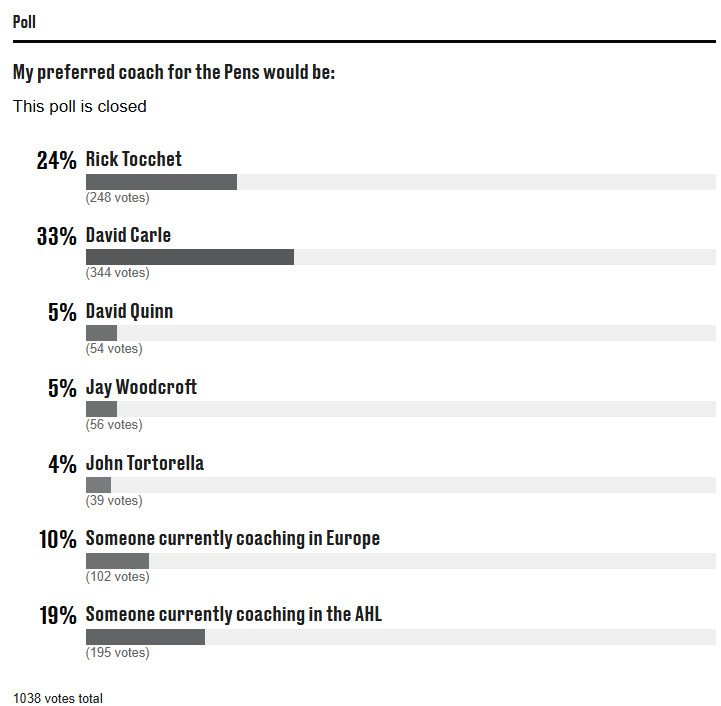 The top two choices are off the board after developments of this month. David Carle gave a “thanks but no thanks” to the entire NHL by signing an extension to remain on at his post at the University of Denver. The second highest community choice, Rick Tocchet, was never linked to the Pens much beyond general fan hopefulness that the popular former Penguin player and assistant coach might be a candidate. Tocchet ended up jumping to other side of the Commonwealth for one of the longest and most lucrative contracts in the whole NHL coaching market on a five-year deal believed to be worth north of $5 million annually.