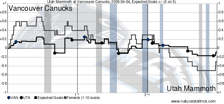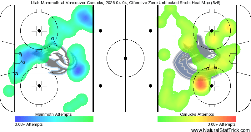 For a 7-4 game, the heat map is pretty lame all things considered. The 5v5 scoring chances were pretty tame, standing at a 12-11 lead for the Canucks with a 6-4 high-danger chance advantage for the Mammoth. If you squint, you can probably see the difference, but other than that, the heat map is pretty unremarkable. It was interesting to see that Utah was trying a lot of shots from the blue line at even strength relative to chances from any other side, but otherwise, there isn’t a whole lot to remark about how these attempts were distributed.