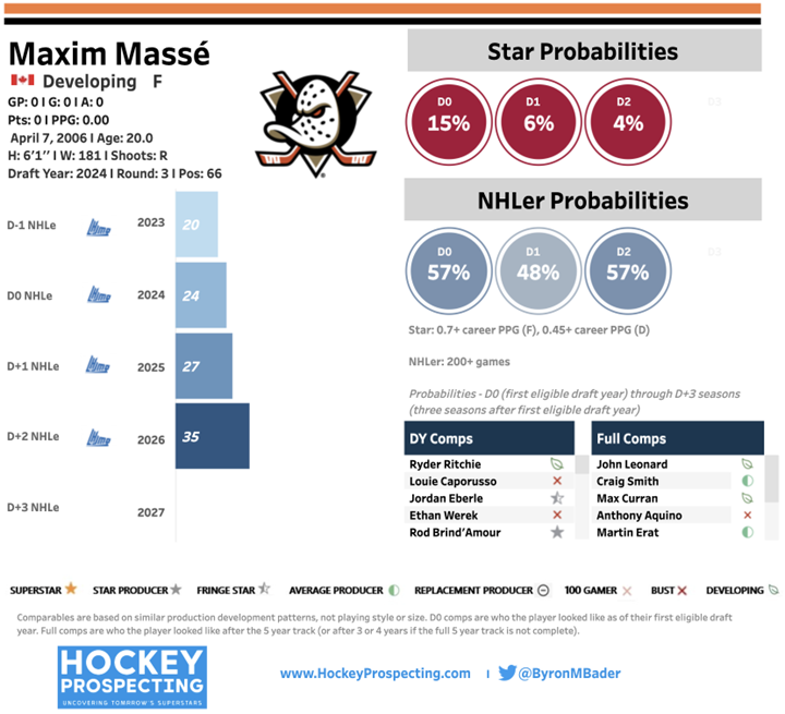 For fantasy purposes, his projection likely tops out as a middle-six, secondary scorer without consistent power-play usage. Players who become fantasy-relevant producers in the QMJHL typically dominate at an earlier age, which adds some skepticism to his profile. His Hockey Prospecting model reflects that concern, giving him roughly a four percent chance of becoming a star. If his current dynasty value is buoyed by his recent production, this is a good opportunity to sell before his role settles into a more modest, lower-ceiling outcome.
