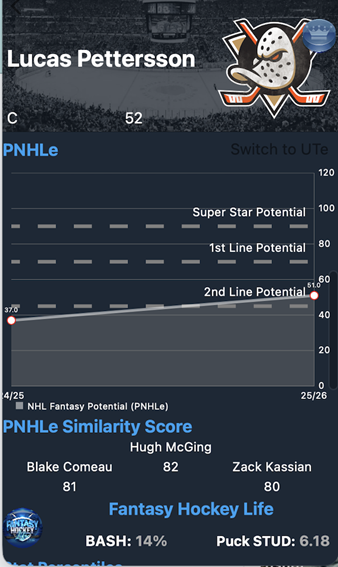 That said, Pettersson projects more as a complementary forward than a primary offensive driver. He lacks a standout elite skill to push him into a top-six role, and as Anaheim’s system grows more competitive, players without distinguishing traits risk being pushed down the depth chart. His pNHLe sits just below 60, aligning with a likely bottom-six role. For dynasty managers, that caps his upside and makes him a candidate to move if others still expect top-six potential.