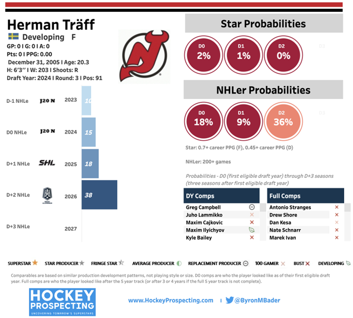 Traff has generated attention thanks to his size and flashes of offensive ability, particularly in junior and his recent play in HockeyAllsvenskan, where he put together an excellent season despite IK Oskarshamn falling short of qualification. He can be difficult to contain along the boards and has shown the ability to create scoring chances when given time and space, leveraging his physical advantages effectively at lower levels.