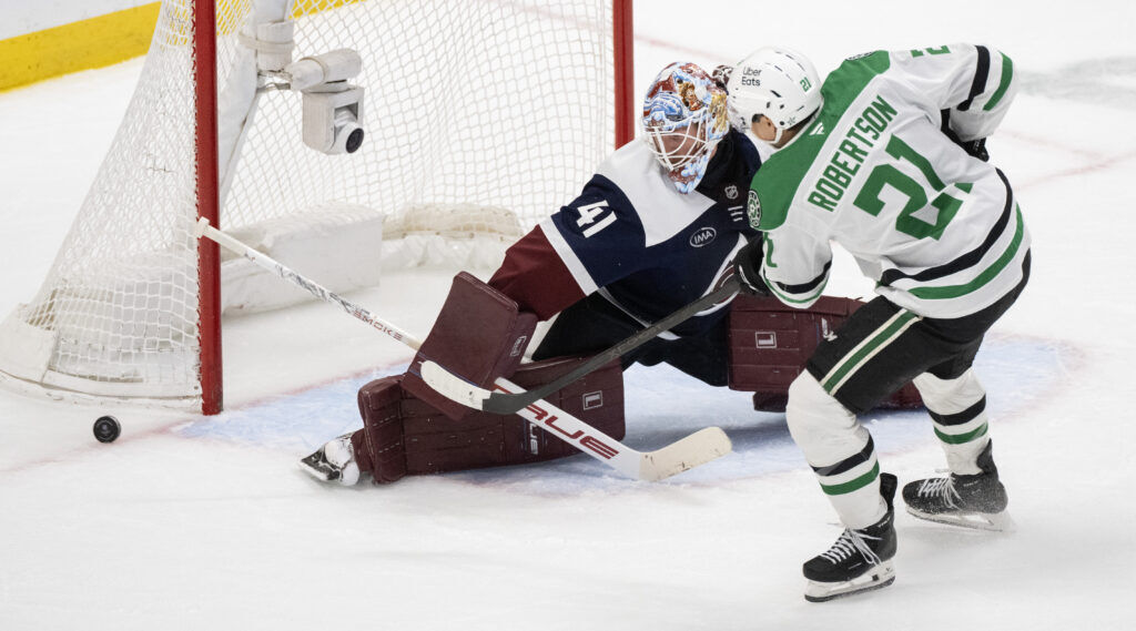 Colorado Avalanche goaltender Scott Wedgewood (41) stops a shot by Dallas Stars left wing Jason Robertson (21) during the overtime period Wednesday, March 18, 2026, at Ball Arena in Denver.The Stars won 2-1 after a shootout. (The Gazette, Christian Murdock)