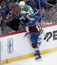 Colorado Avalanche center Parker Kelly (17) checks Dallas Stars defenseman Esa Lindell (23) into the boards Thursday, May 1, 2025, during the third period in game 6 of the first round of the NHL Playoffs at Ball Arena in Denver. The Avalanche won 7-4 to force a game 7 in Dallas Saturday. (The Gazette, Christian Murdock)