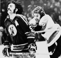 Philadelphia Flyers Dave Schultz catches up to Kansas City Scouts Brent Hughes for the start of a fight in Philadelphia in April of 1975. As the Flyers’ best fighter he helped the team earn their nickname “Broad Street Bullies.” (AP Photo)