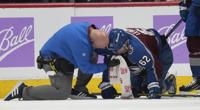 Colorado Avalanche trainer Matt Sokolowski tends to Colorado Avalanche left wing Artturi Lehkonen (62) after he was injured in the second period of an NHL hockey game Thursday, Nov. 9, 2023, in Denver. (AP Photo/David Zalubowski)