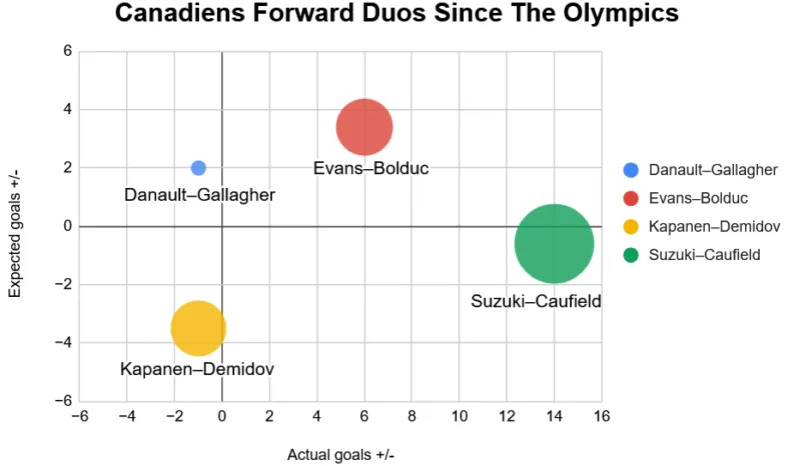 To visualize how different parts of the lineup have performed since the Olympics, I’ve compiled the ‘goal +/- and xGoal +/- stats of four forward duos in the chart below. I’ve done this instead of using full lines, because they have been altered during the stretch, but the duos have stayed together, for the most part, since late February.